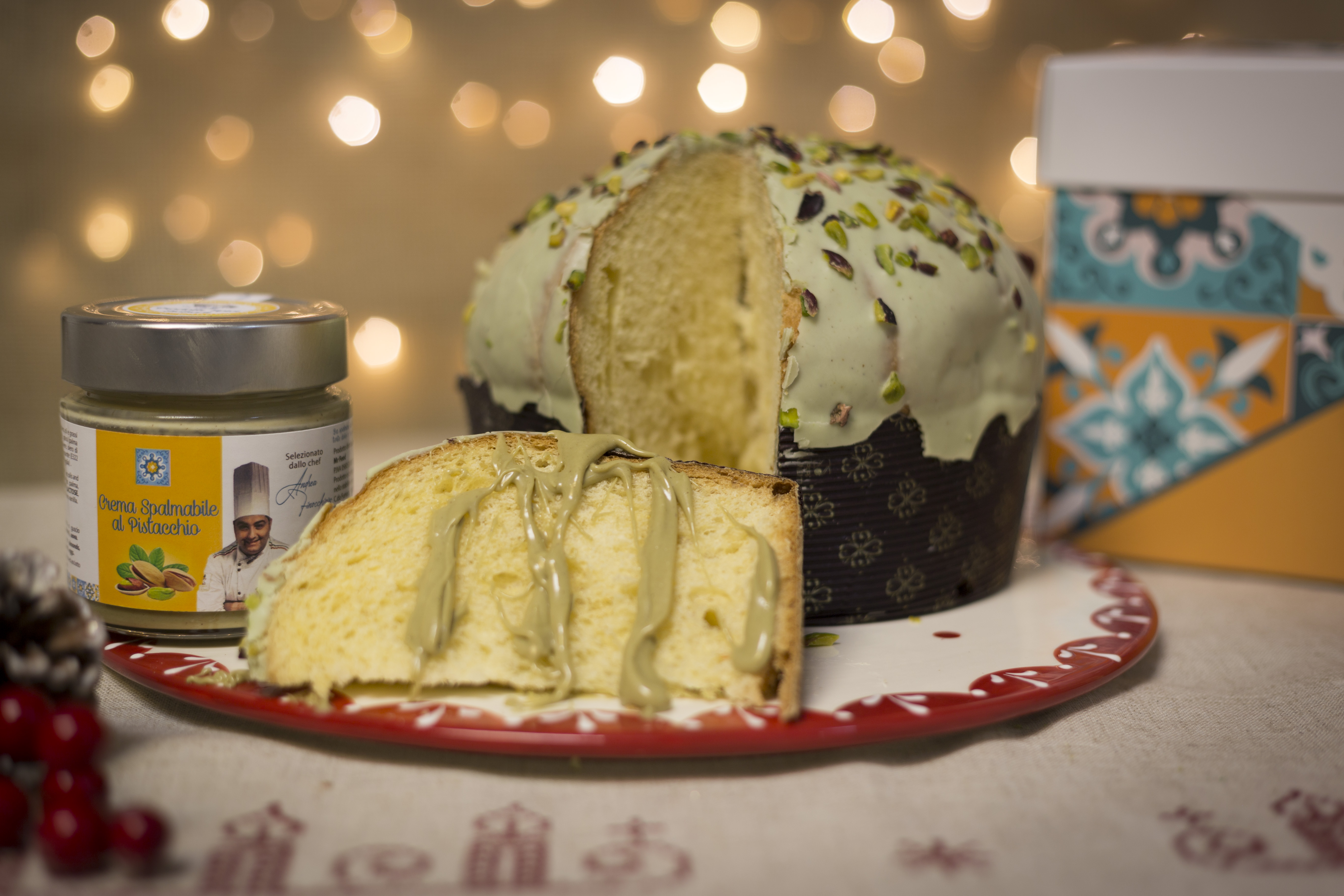 a personaPANETTONE AL PISTACCHIO DA KG 1 CON VASETTO DI CREMA DI PISTACCHIO